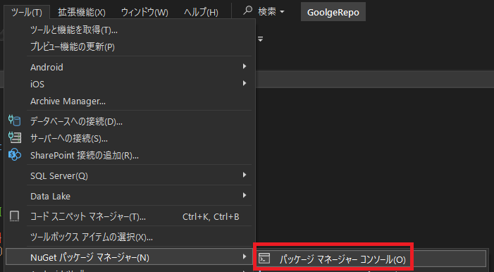 パッケージマネージャーコンソールは『ツール』>『NuGetパッケージマネージャー』>『パッケージマネージャーコンソール』で起動できます