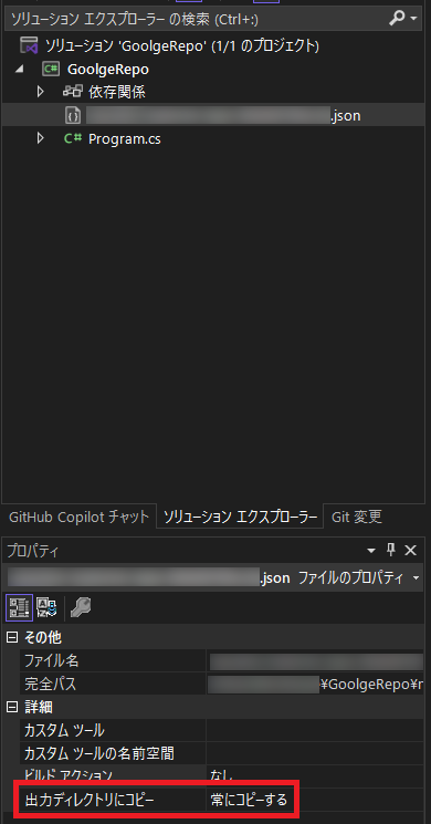 JSONファイルをプロジェクトフォルダ配下に配置して『出力ディレクトリにコピー』を『常にコピーする』に変更します