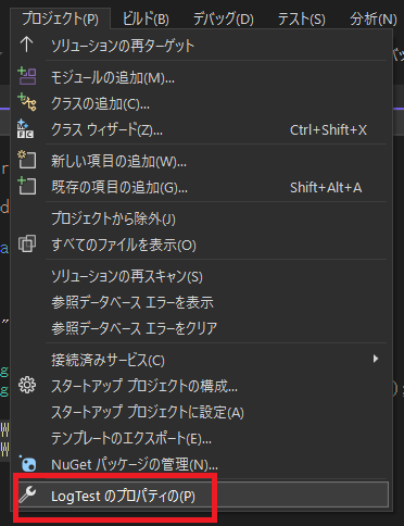 先ほどの追加のと同じようにVisualStudioの対象プロジェクトソリューションのプロジェクト>【プロジェクト名】のプロパティをクリック