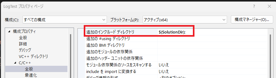 構成プロパティ>C/C++>全般>追加のインクルードディレクトリ>【$(SolutionDir);】を追加します。これでSPDLOGを使用できるようになりました