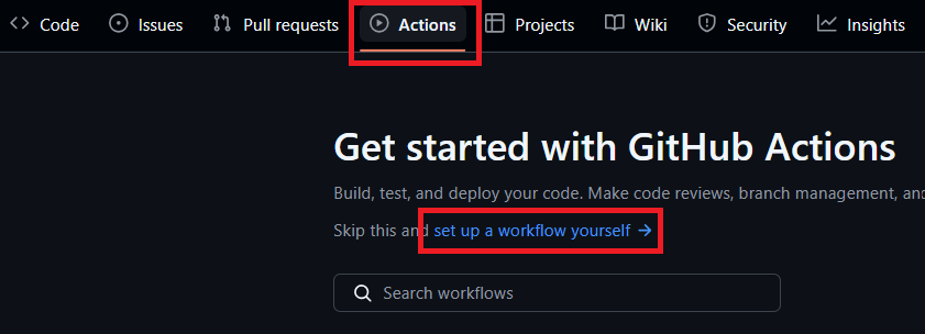 対象のリポジトリ上でActionsというタブを選択し、今回は自前で内容を作成するので「set up a workflow yourself」を選択します