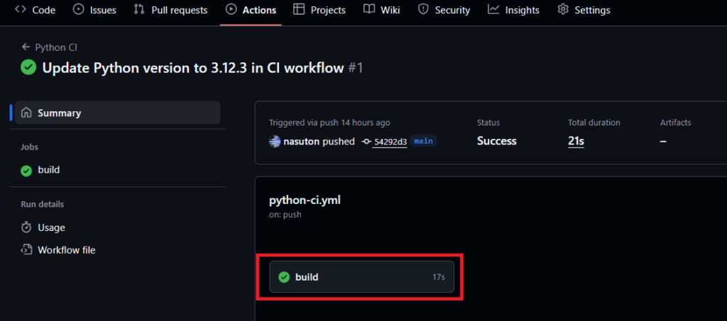 先ほど作成したymlファイル(今回はpython-ci.ymlとなっています)のところに、「build」という項目があるのでそちらをクリックします