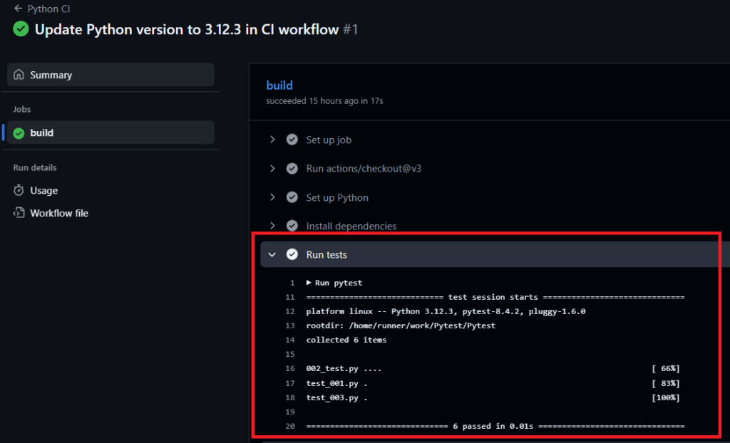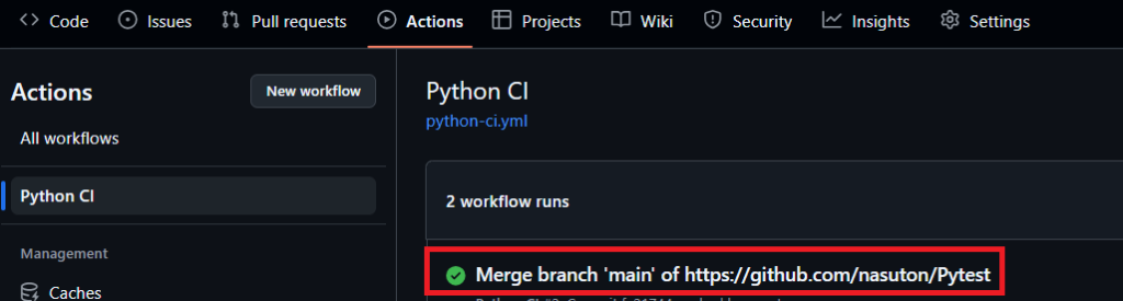 先ほど設定した内容は参考サイトにも記載がありますが、mainブランチへのプッシュやプルリク時に自動でpytestが実行されます