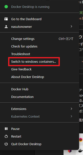 Dockerが起動している状態で右下のタスクトレイ上のアイコンを右クリックして、その中から「Switch to windows containers ...」をクリックしてwindowsコンテナに変更します。警告ウィンドウが出ますが、切り替えても問題ない場合は「Switch」をクリックして切り替えが完了します